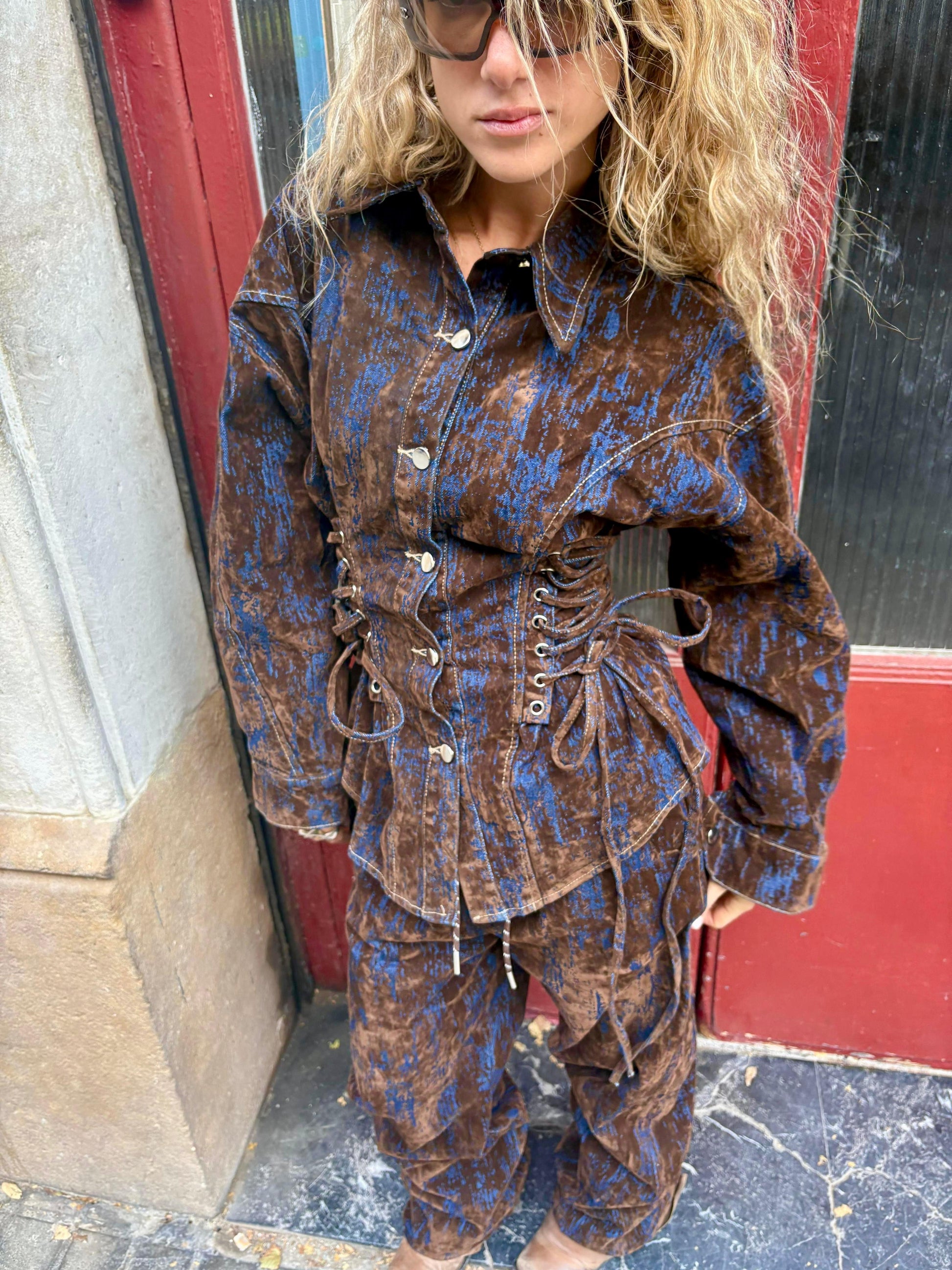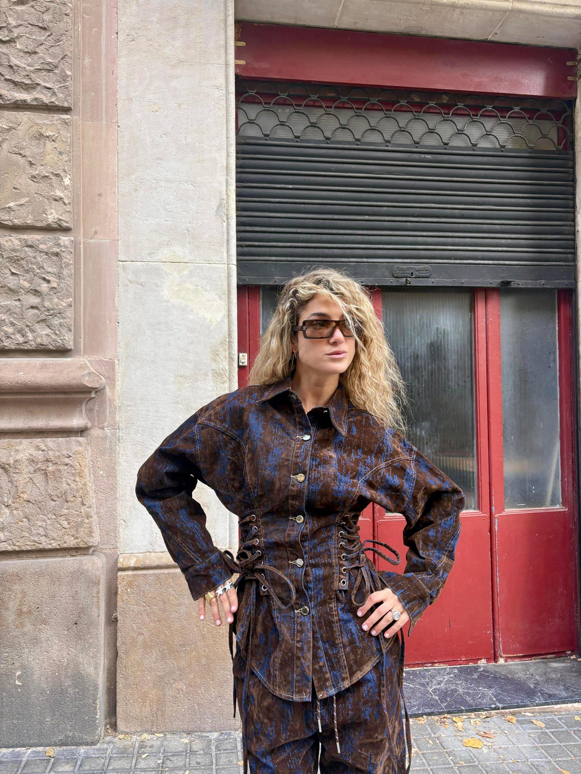 Chaqueta denim con acabado aterciopelado en tonos café y azul, con cordones laterales ajustables que definen la silueta sin perder el fit relajado.